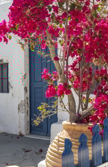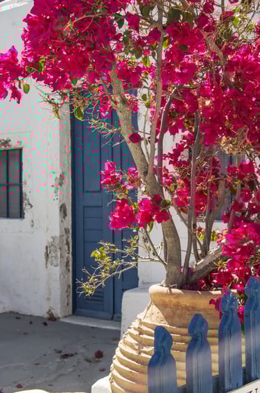 -Trekking da Fira a Oia: percorriamo splendidi panorami sulla caldera e sul mar Egeo, attraversando case dal bianco accecante, porte blu con colorati filari di bougainville e caratteristici negozietti.