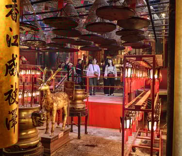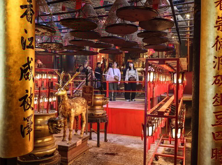 Proseguendo verso l’area di Sheung Wan si incontra uno dei templi più antichi della città, il suggestivo Man Mo Temple. Costruito a metà Ottocento, è dedicato alle divinità della letteratura (Man) e della guerra (Mo). All’interno, enormi spirali d’incenso pendono dal soffitto creando un’atmosfera mistica e quasi fuori dal tempo: un angolo autentico che racconta l’anima più tradizionale di Hong Kong.