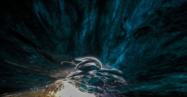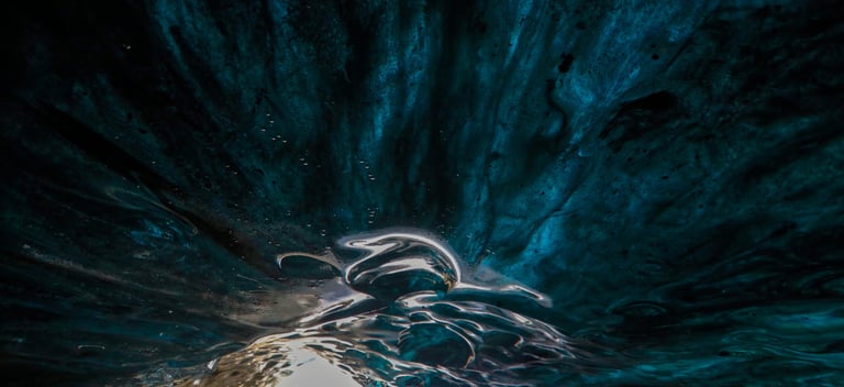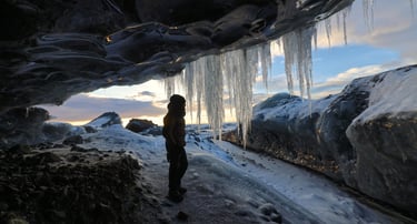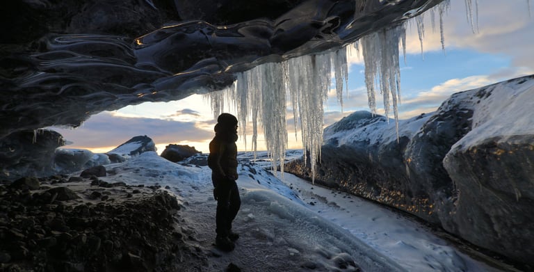 Il mattino successivo ritorniamo a Jökulsárlón, dove abbiamo l'incontro con la nostra guida (iceguide.is) che ci porterà nel cuore delle grotte di ghiaccio: un'esperienza possibile solo nei mesi freddi da novembre a marzo. Nell'avvicinamento in Superjeep vediamo il sole sorgere, branchi di renne e guadi ghiacciati, in uno scenario paesaggistico spettacolare. Le grotte di ghiaccio si formano in aree remote del ghiaccio del Vatnajökull, il più grande d'Europa.