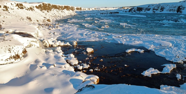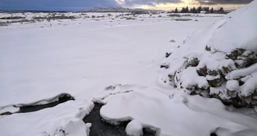 Si tratta del percorso più popolare d'Islanda, che tocca molti punti panoramici degni di nota. Ma percorrerlo in inverno può non essere un'impresa così semplice, la neve limita la visibilità e il bianco della strada si confonde con il cielo. Prima tappa è il Parco Nazionale di Þingvellir, un canyon lavico che segna il punto d’incontro tra la placca tettonica nordamericana e quella eurasiatica. In inverno la neve impedisce di proseguire oltre la cascata ghiacciata di Öxarárfoss.