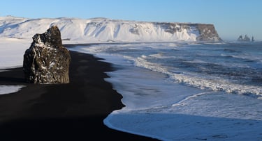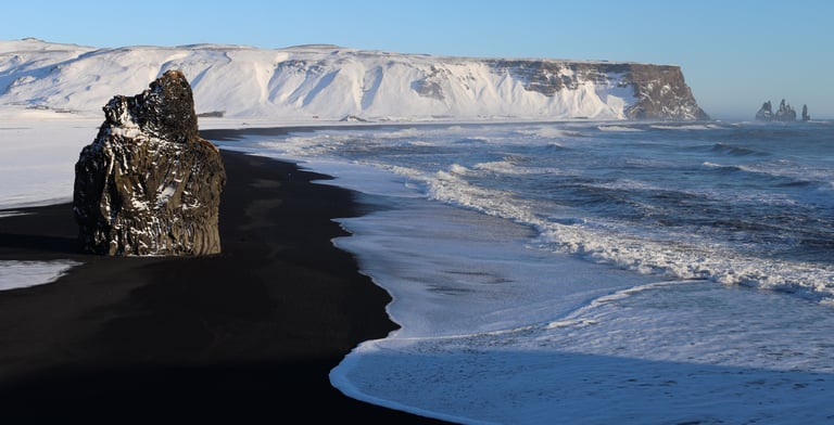 Percorrendo la stessa strada, si raggiunge il promotorio di Dyrhòlaey, con le sue alte scogliere, dove il mare incontrano lunghe distese di sabbia nera, in perfetto contrasto con il candore della neve. Ma la spiaggia nera più pericolosa di tutte resta Reynisfjara, per la potenza delle sue onde, famosa per le conformazioni di basalto.