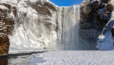 Un delle cascate più impressionanti è sicuramente Skògafoss, con il suo salto di 60 metri. Per assicurarsi diversi punti di vista si può raggiungere la base della cascata, oppure percorrere la scalinata per una prospettiva dall'alto, facendo attenzione a non scivolare.