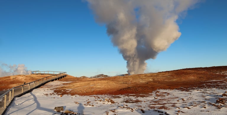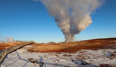 Proseguiamo verso la Blue Lagoon, l'inflazionato sito termale, visitabile anche esternamente con un sentiero che si snoda tra le caratteristiche azzurre acque provenienti dalla vicina centrale geotermica. Infine raggiungiamo le pozze di fango e gli alti vapori di Gunnuhver e le selvagge scogliere di Reykjanestà prima di salutare l'isola del ghiaccio e del fuoco.