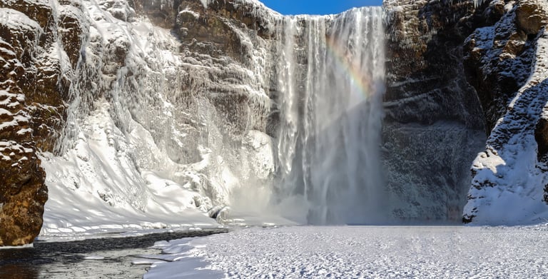 La luce del mattino illumina questo bianco scenario, nonostante le temperature siano di molti gradi sotto zero. Raggiungiamo la parte Sud dell'isola, dove per prima incontreremo Seljalandsfoss. Particolare per la possibilità di camminarci dietro ed essere raggiunti dai suoi spruzzi, ma solo nei mesi estivi. E' possibile però raggiungere la vicina cascata nascosta dalle rocce di Gljufrabui.
